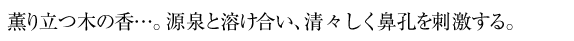 その樽の香りと源泉の香りが心地よく鼻孔を刺激し、